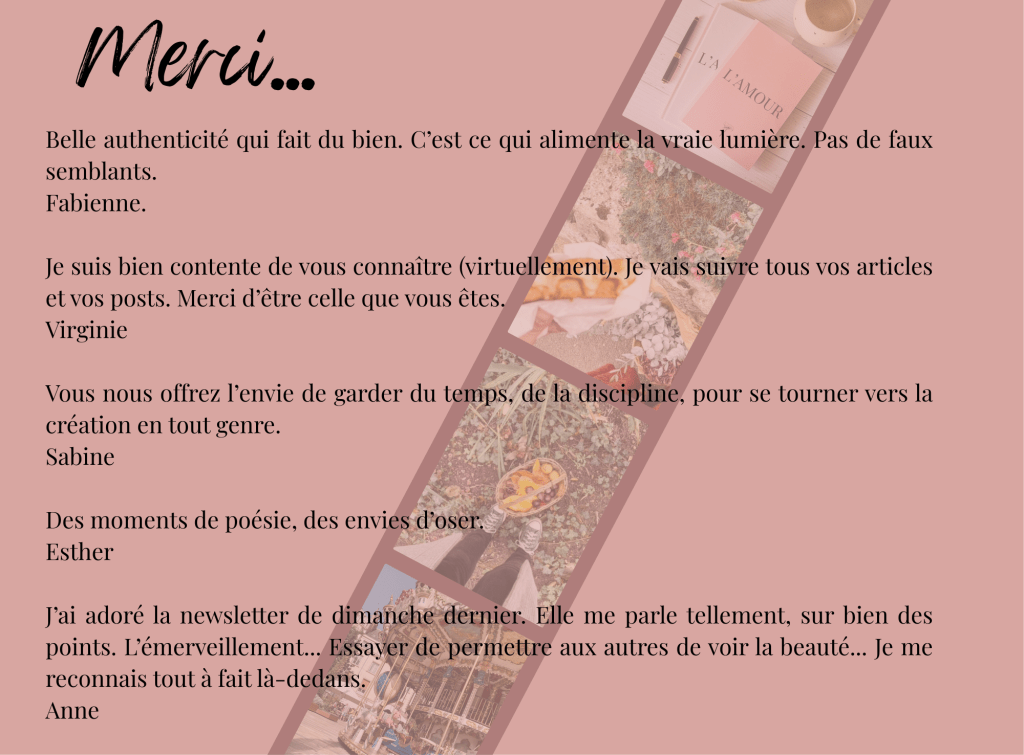 Un dimanche sur deux, pour le prix d’un cappuccino mensuel, je vous envoie une petite lettre pleine d’amour, l’Escale Poétique, dans laquelle je vous propose des bribes de mon cheminement intérieur et j’interroge l’amour, le désir, les fantasmes, le versant lumineux ou sombre de la sexualité, mais aussi le quotidien, la beauté, la vie, l’écriture, et les jolies choses qui m’ont inspirées.