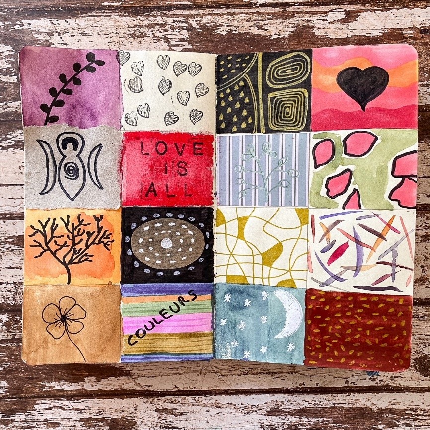 2. Une case par jour : l’idée vient de Manon Lavoie. Il s’agit de diviser une double page de son journal en plusieurs cases, et d’en remplir une par jour. Chaque case peut être totalement différente (un jour peinture, un jour un petit dessin, un jour un mot), ou bien on choisit un lien : un doodle par jour, une lettre en calligraphie, un papillon aux ailes différentes, un motif, uniquement une couleur… les possibilités sont infinies, et j’aime vraiment beaucoup ce petit exercice : je ne le fais pas au long cours, mais parfois sur une semaine ou une quinzaine de jours, cela me permet de remettre un peu de peps quand je me sens enfermée dans une routine un peu ennuyeuse, car alors j’utilise des techniques que j’ai laissées de côté. Vous pouvez aussi, plutôt que case, faire « une page par jour » : c’est ce que j’ai fait pendant le confinement dans ce qui a fini par aboutir au journal poétique, et non seulement cela m’a permis de me maintenir à flot, mais comme on le voit, cela a fini par donner autre chose de plus vaste !