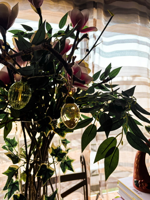 J’ai donc repris les éléments de la décoration de l’an dernier, mais je les ai arrangés différemment pour certains, tout en gardant la thématique « jardin magique » que j’aime beaucoup, et j’ai insisté sur les fleurs fraîches, qui sont de toute façon le grand amour de ma vie.