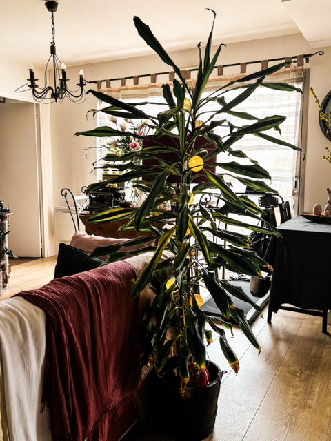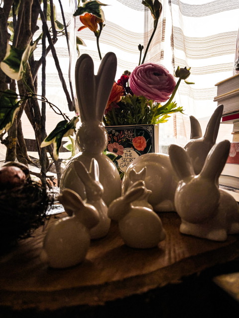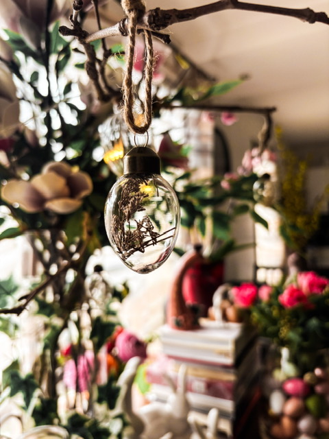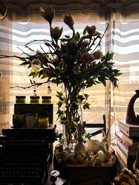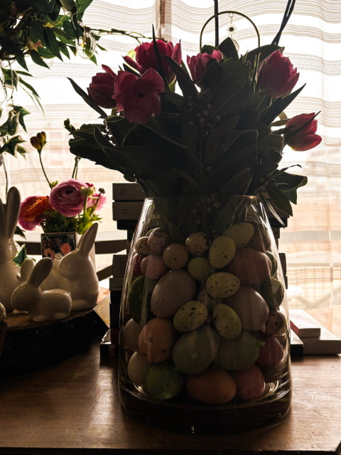 Je n’ai pas acheté beaucoup de décoration nouvelle, cette année : j’avais déjà ce qu’il me fallait. J’ai simplement repris deux branches de faux magnolia pour l’arbre des saisons (qui restera comme il est jusqu’à l’automne) deux mini-lapins et un pot en forme de coquille d’œuf. J’ai aussi rapporté un œuf décoratif de Dubrovnik, mais je le mettrai au dernier moment.