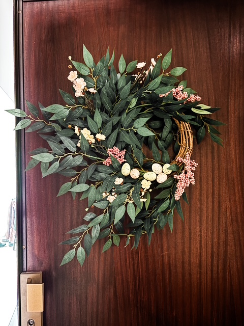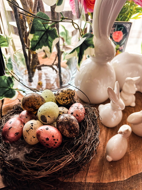 Tout n’est pas tout à fait terminé, mes décorations de saison sont toujours des projets évolutifs, je pense notamment acheter quelques fleurs artificielles pour le vase avec les œufs sinon je vais me ruiner en fleurs fraîches, il me manque également les gourmandises, mais pour l’essentiel, on y est :